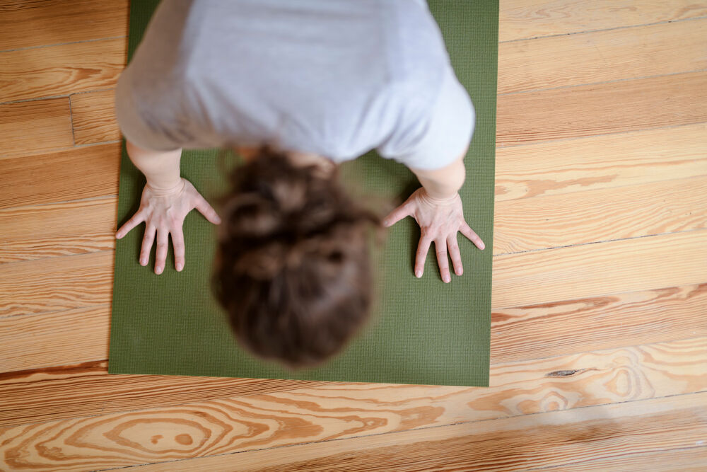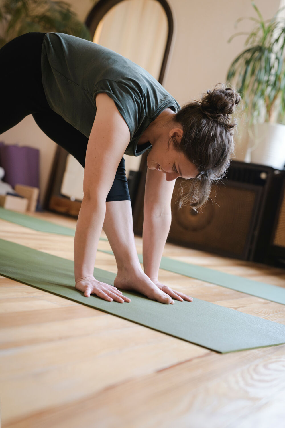 Der Yoga-Raum in der Langen Straße 80 von Brede-Yoga ist ein eher gemütlicher Raum mit warmen Farben, Holzfußboden und mehreren Fenstern. Es liegen Matten, Kissen und Decken für euch bereit.