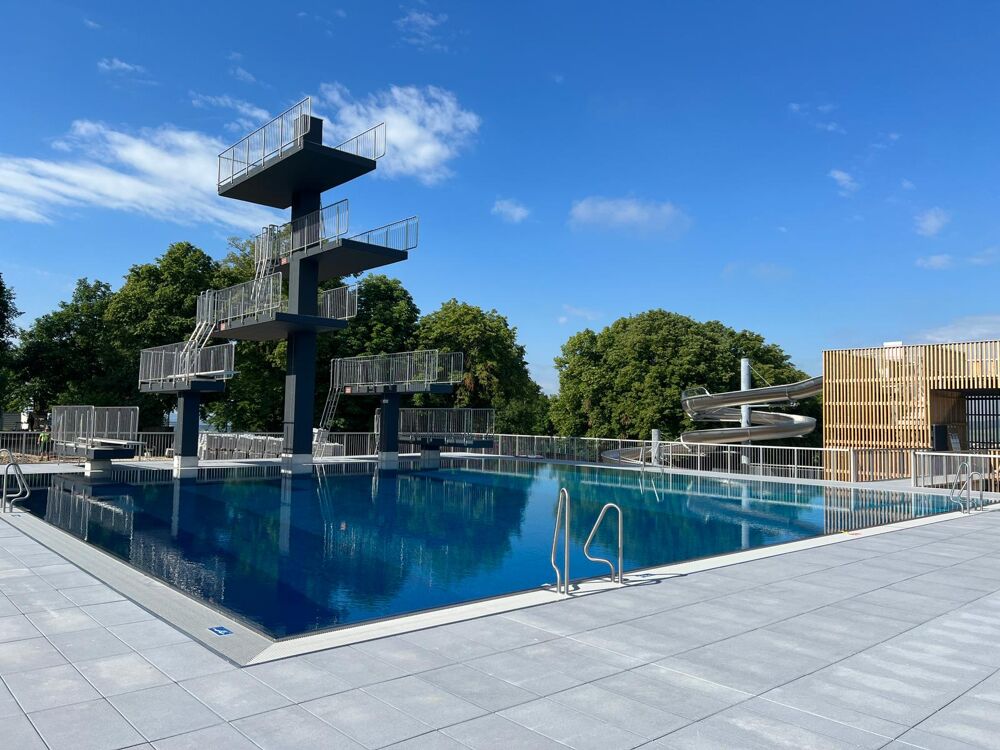 Unmittelbar daneben befindet sich das Sprungbecken mit einem 10 m hohen Sprungturm.