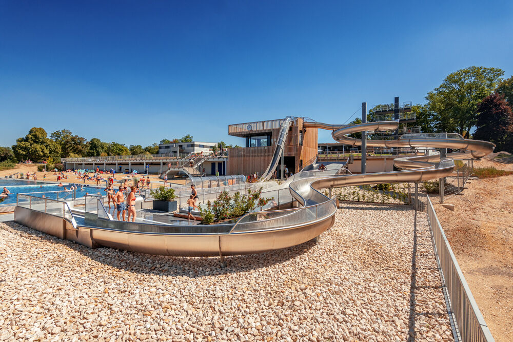 Von den Umkleidekabinen gelangen Sie direkt auf die großflächigen Liegewiesen.