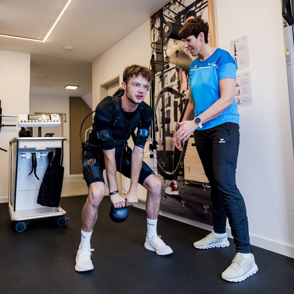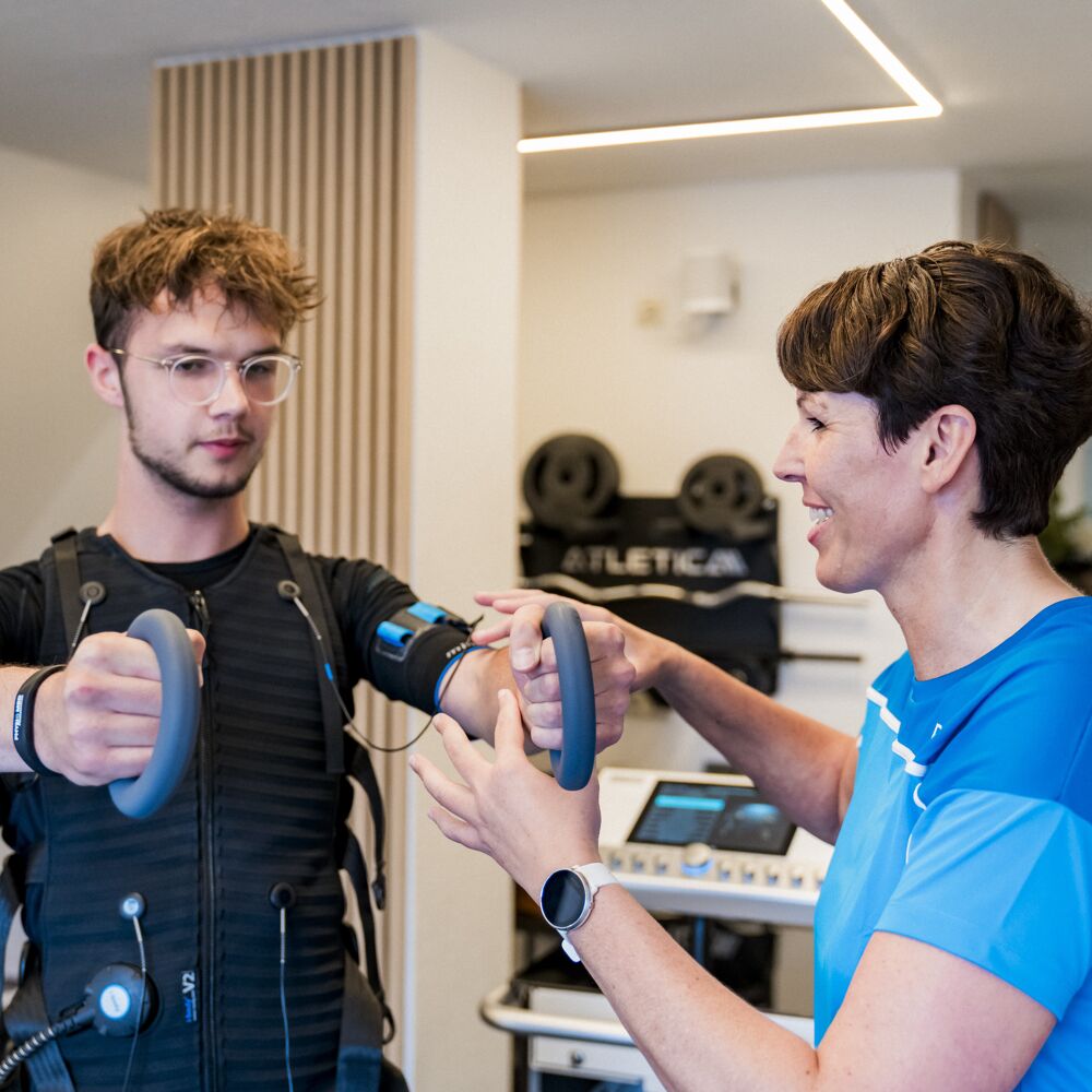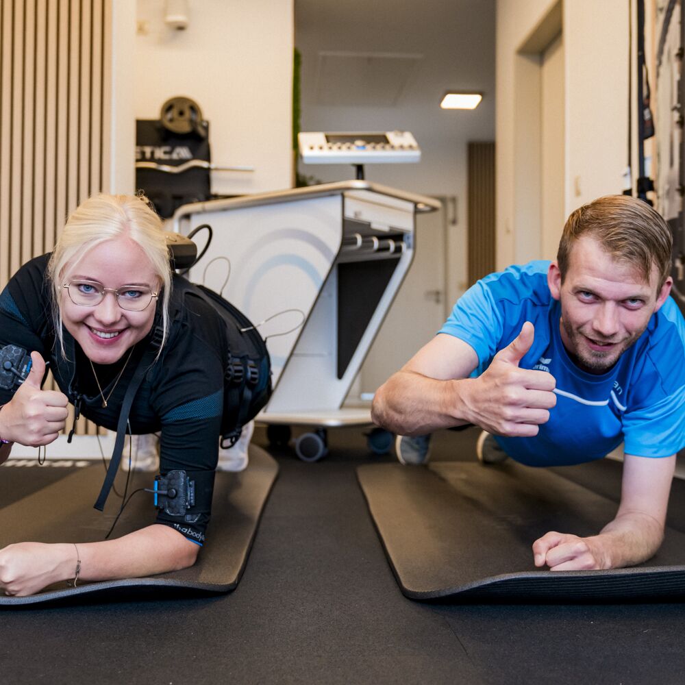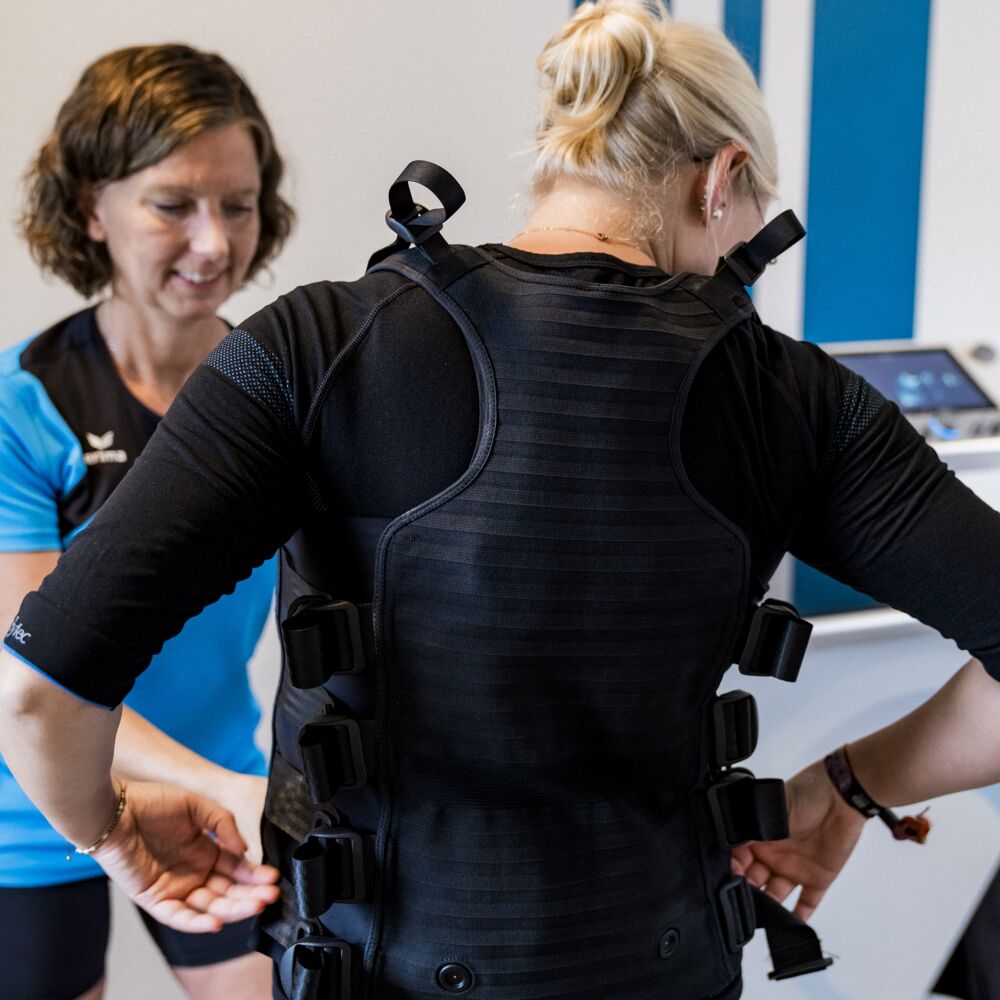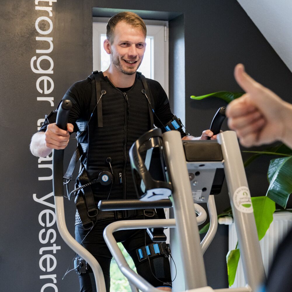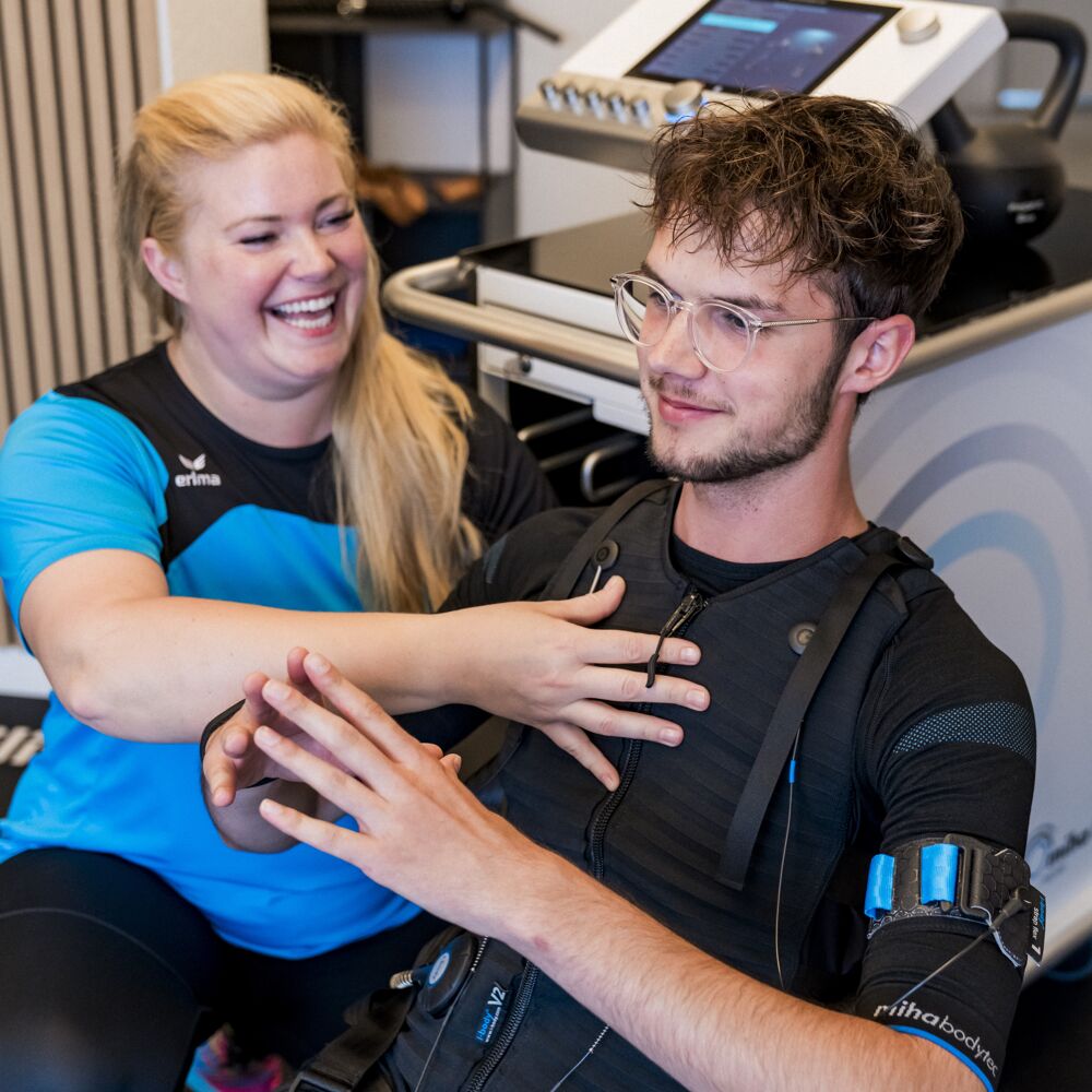 EMS ist eine Kombination aus normalem Training und durch Strom getriggerter Muskelkontraktion, wodurch mehr Muskelfasern trainiert werden können, als der eigene Körper es je könnte.