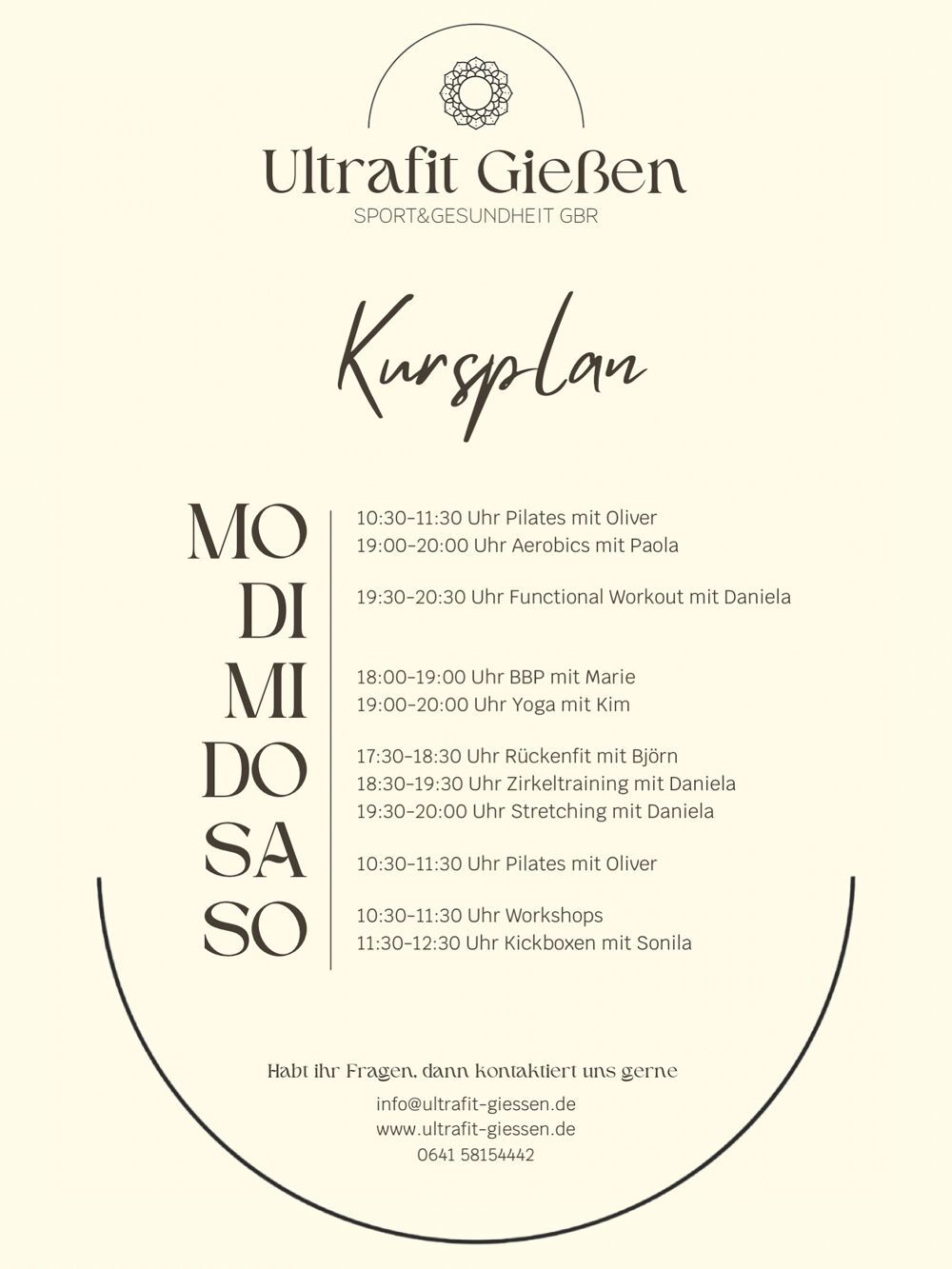 Ultrafit Sport + Gesundheit GbR im Herzen von Gießen-Wieseck ist die beste Wahl, wenn du ein Boutique-Fitnessstudio mit familiärer Atmosphäre suchst. Es erwarten dich moderne Technogym-Geräte, einzigartige Cardio-Geräte sowie vielseitige Kurse wie Pilates, Yoga und funktionales Training. Unser Team unterstützt dich dabei deine Ziele zu erreichen. Für die Teilnahme an den Fitnesskursen ist eine Buchung erforderlich.