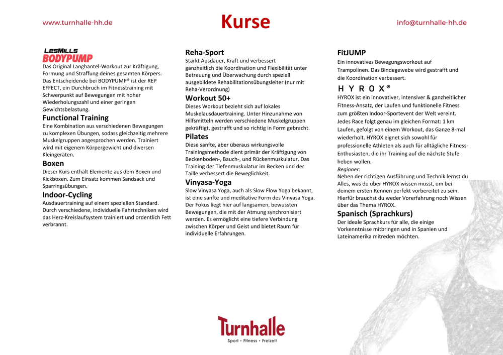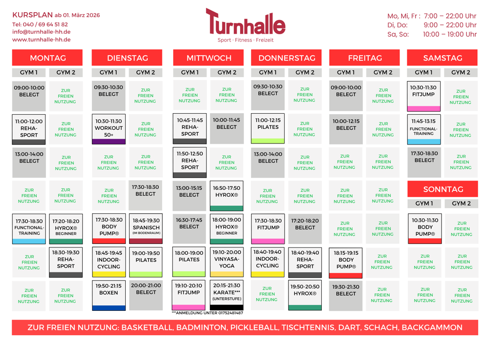Massageliegen, Tischtennis, Basketball, Badminton, Boxsack. Zur Teilnahme an den Kursen bitte über die Homepage anmelden: https://turnhalle-hh.de/indoor-kurse/