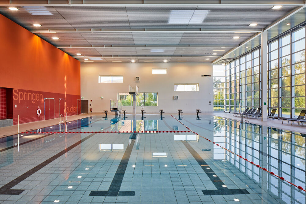 Die Schwimmhalle Inselpark überzeugt mit moderner Architektur und Blick ins Grüne. Das 25-Meter-Becken bietet viel Raum für sportliches Schwimmen. In den Sommermonaten sorgt die zu öffnende Südfassade für ein Freibadgefühl mit Zugang zur Außenterrasse.
