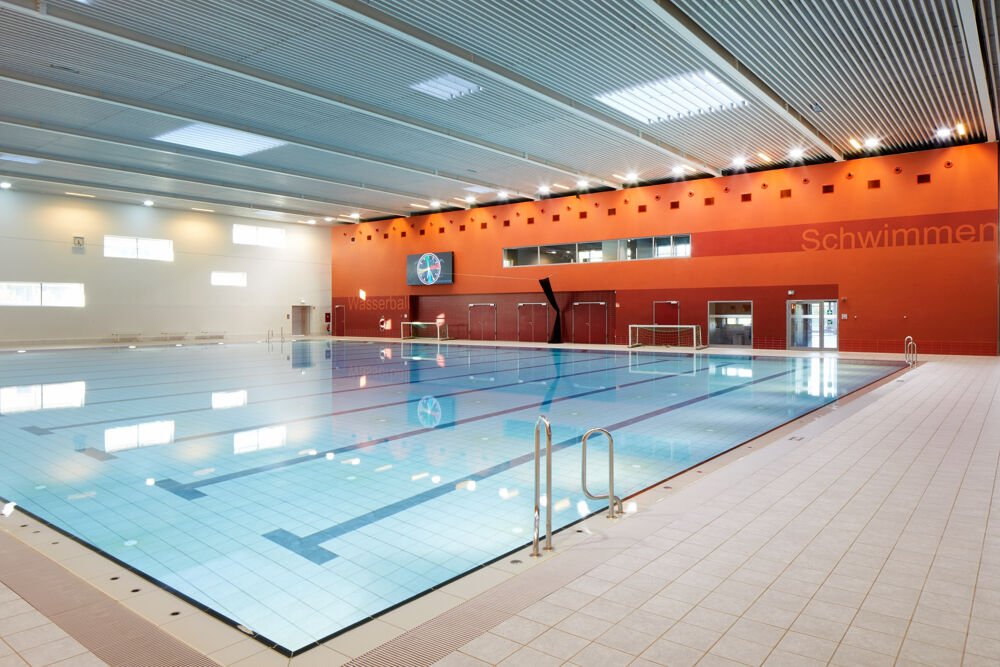 Die Schwimmhalle Inselpark überzeugt mit moderner Architektur und Blick ins Grüne. Das 25-Meter-Becken bietet viel Raum für sportliches Schwimmen. In den Sommermonaten sorgt die zu öffnende Südfassade für ein Freibadgefühl mit Zugang zur Außenterrasse.