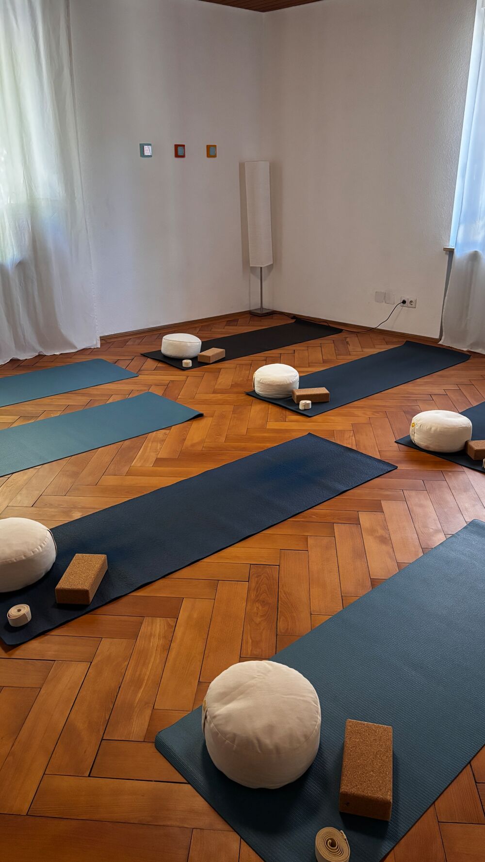 Matten und weiteres Equipment wie Blöcke, Gurte, Decken sind vorhanden.