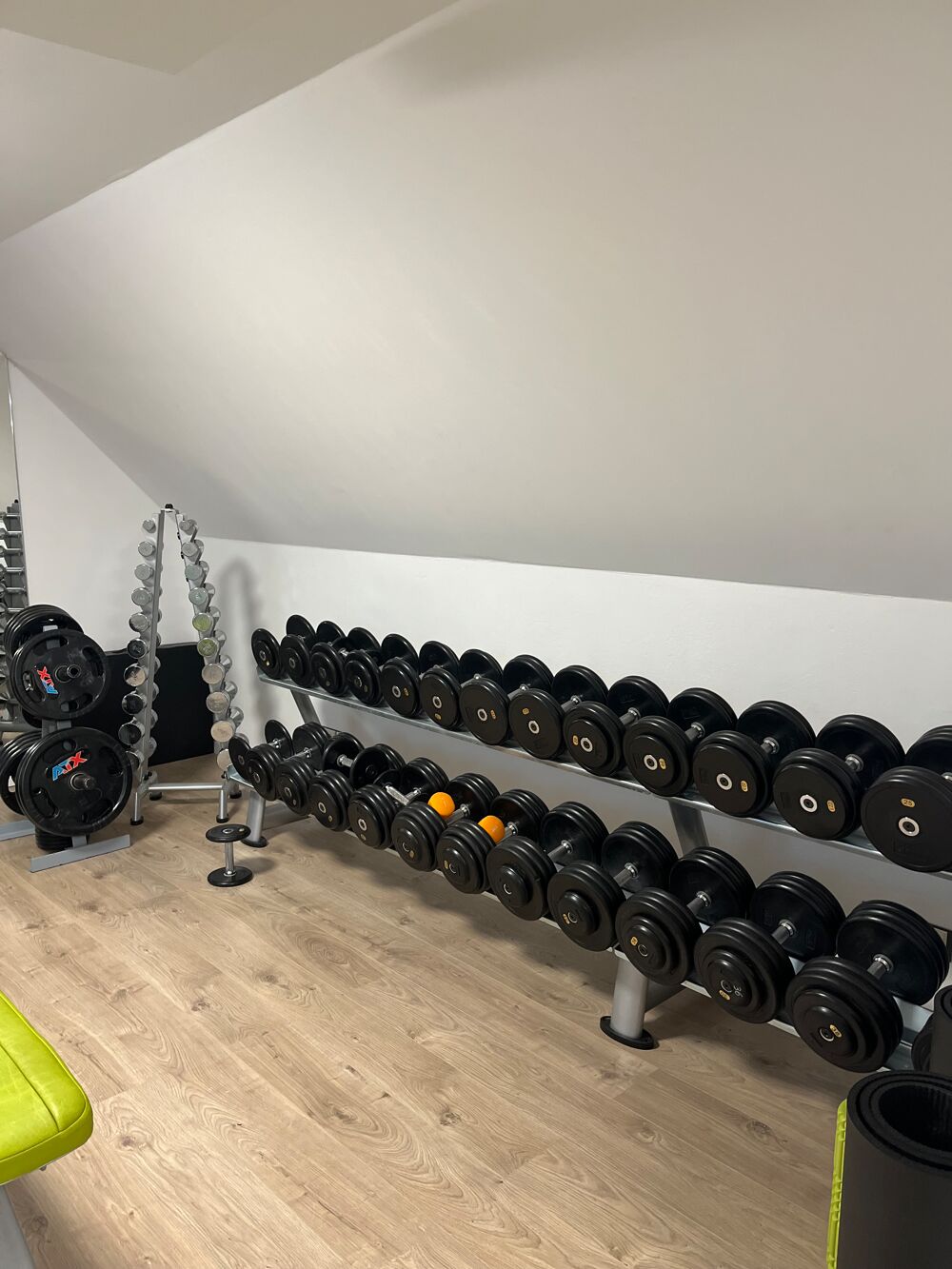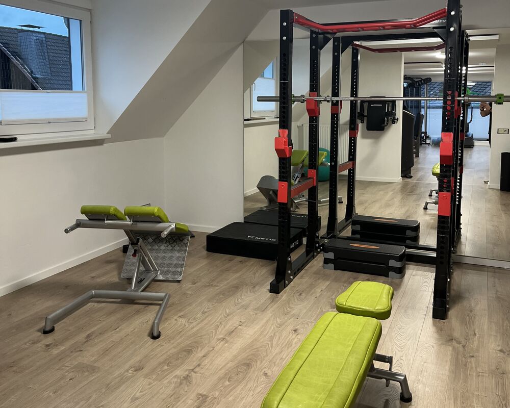 Unser Fitnessloft im Obergeschoss zeichnet sich durch einen kleinen Freihantelbereich mit Squad-Rack , Seilzugturm und weiteren EGYM-Geräten aus.