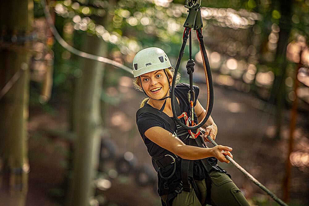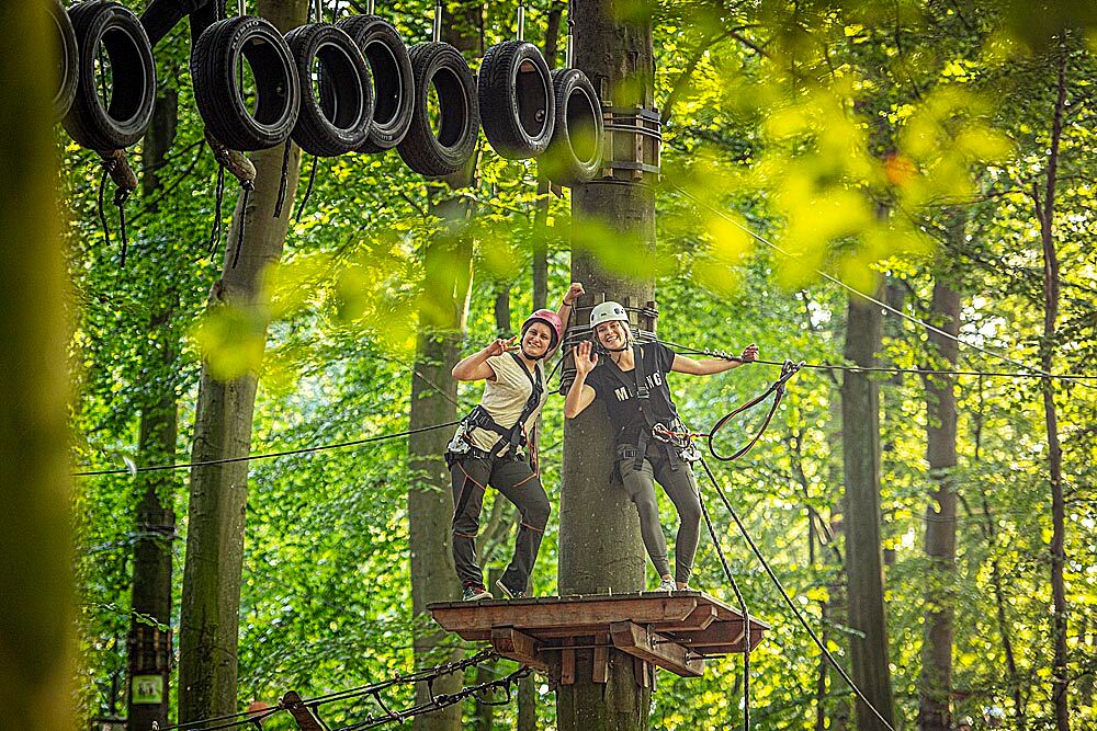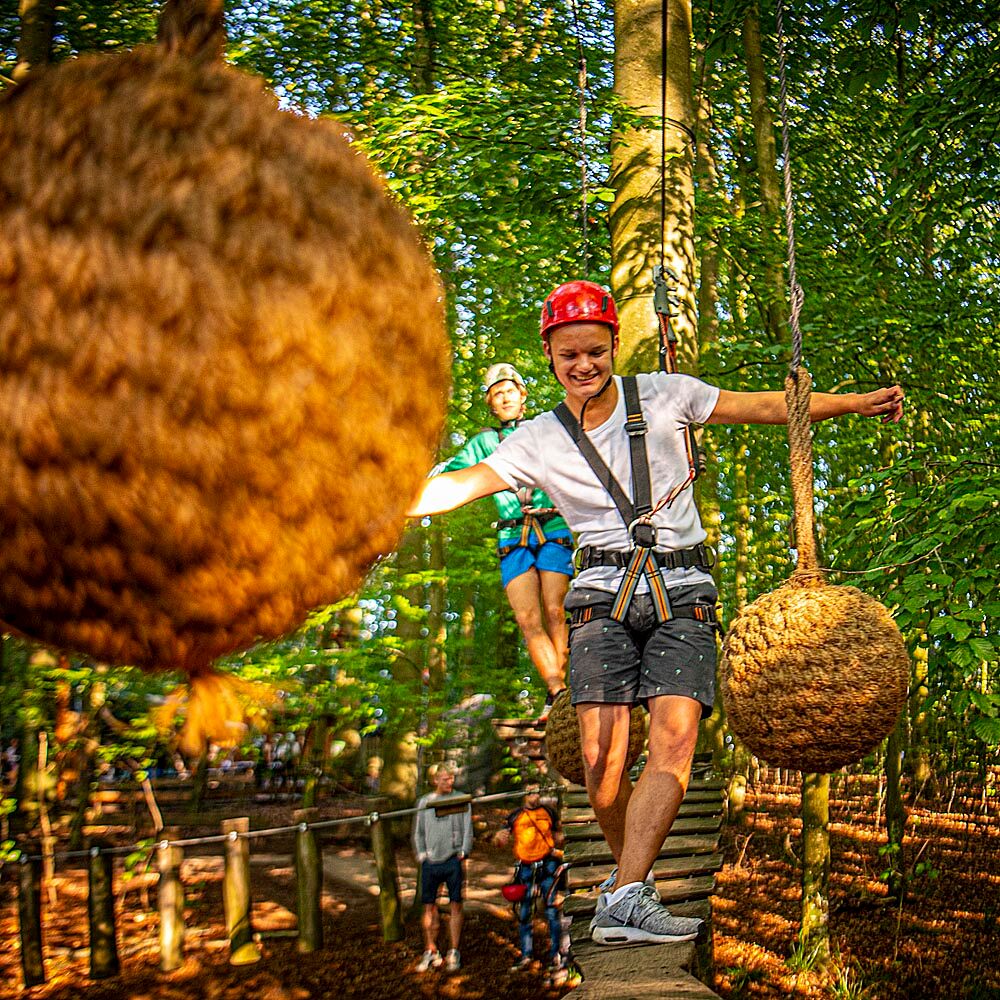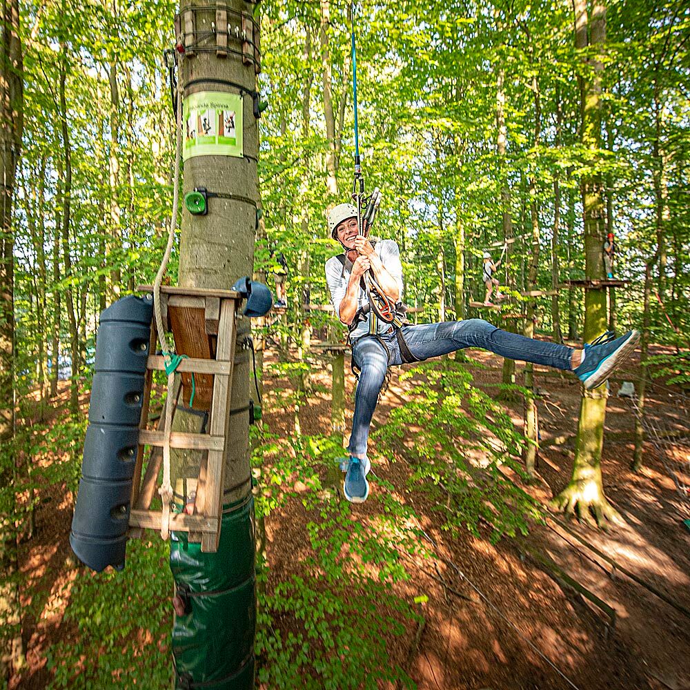 Venture onto wobbly suspension bridges in northern Germany's largest climbing park, swing from tree to tree, climb to the treetops or whizz through the air on our mountain board.