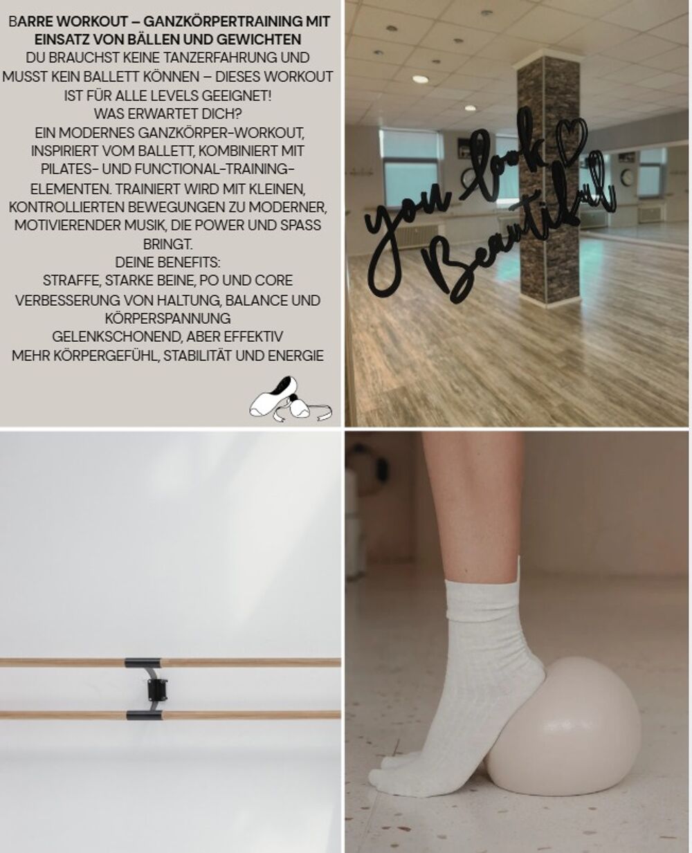 A modern full-body workout inspired by ballet, combined with Pilates, functional training elements and yoga.