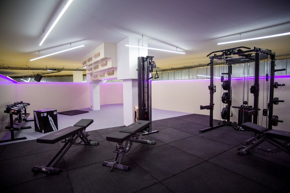 Our spacious fitness area is located on the large central block and is accessible via a staircase. This means that, just like in the Zeitströmung, you have the opportunity to watch the boulderers down in the hall while you train.