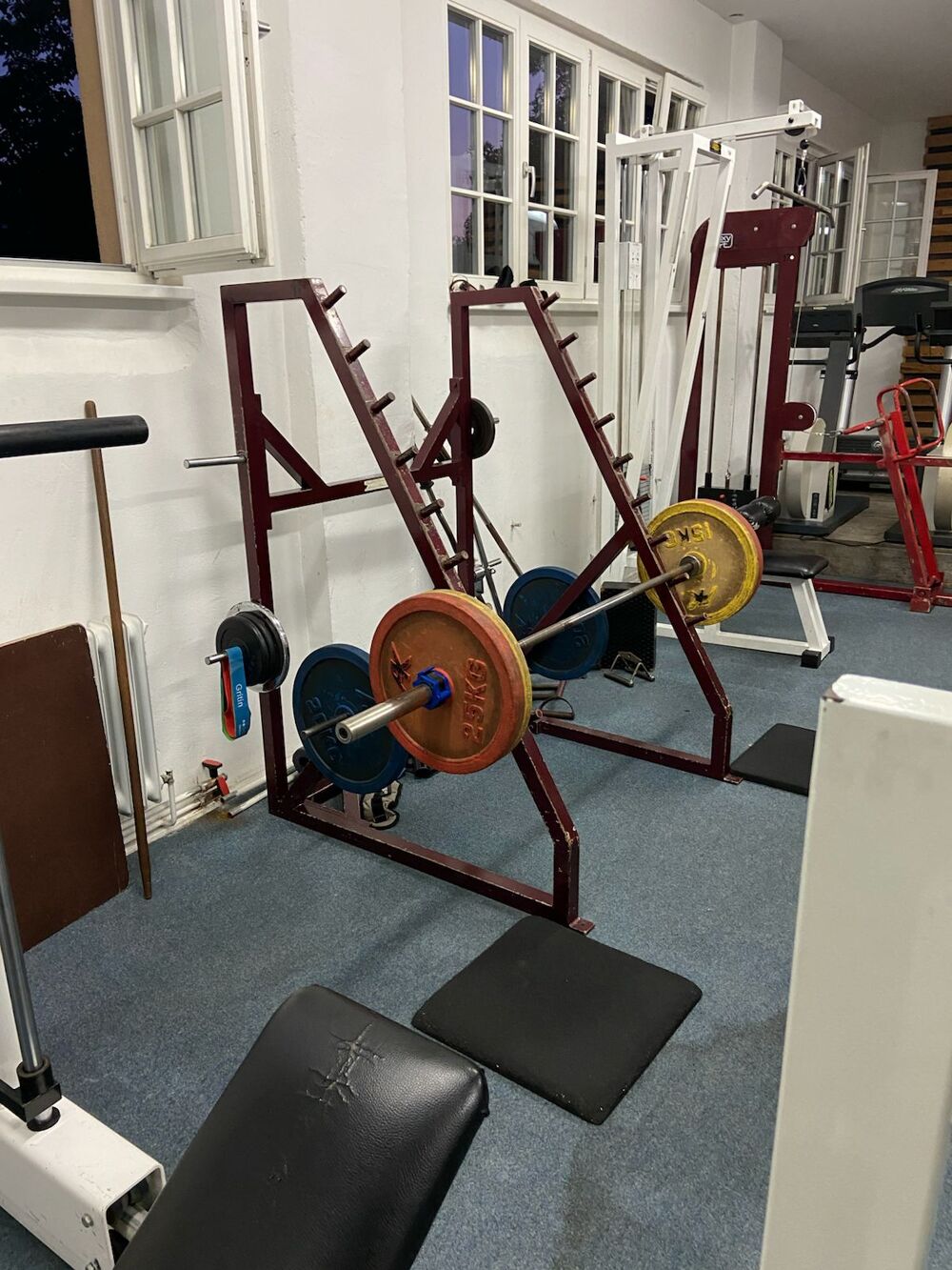 - Free weights area: This area is equipped with dumbbells, barbells, benches and a squat rack.