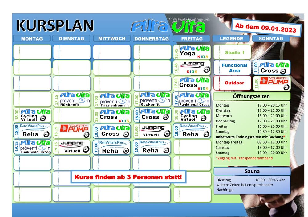 In addition to the courses Backfit. Yourfit Pump, Fascia Training and Cross-Functional Fitness, we currently have virtual courses in Jumping and Cycling. In addition, there are the prevention and rehabilitation courses. For children there are Cross, Jumping and Yoga.