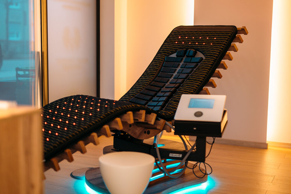 The reLounge lounger is a CE and FDA-certified medical device for relieving the back, muscles and nervous system. It combines EMS impulses, TENS, heat therapy and deep massage in one system that also reaches deeper muscle and fascia structures, promotes blood circulation, relieves tension and supports regeneration.