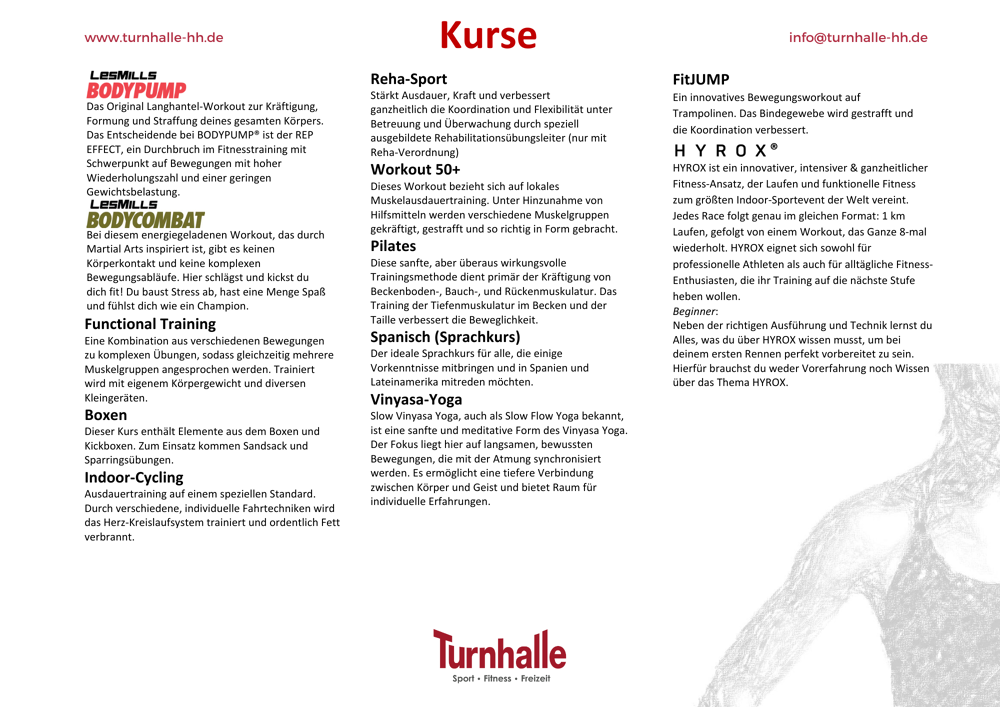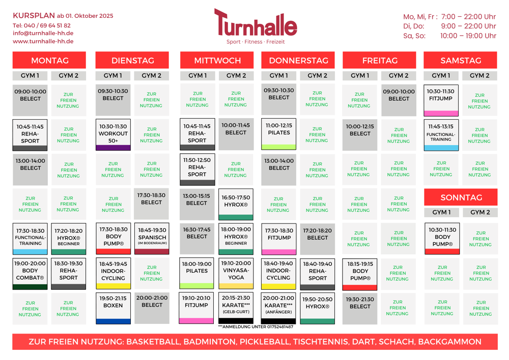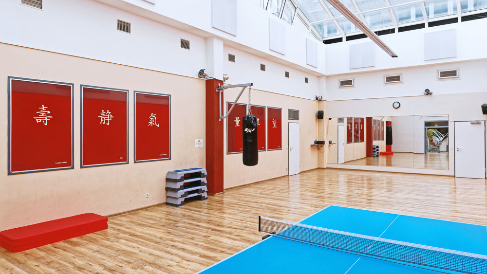 Massage tables, table tennis, basketball, badminton, punching bag. To participate in the courses please register via the homepage: https://turnhalle-hh.de/indoor-kurse/