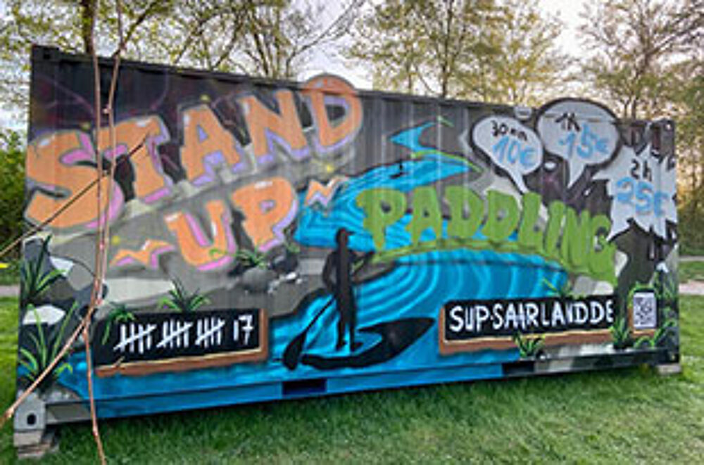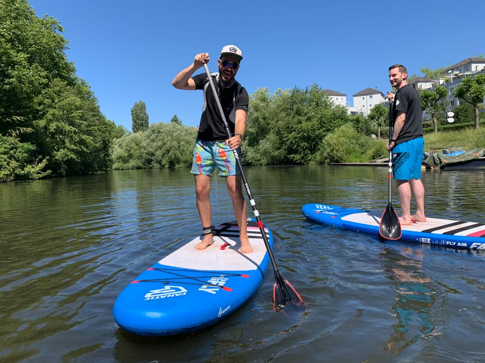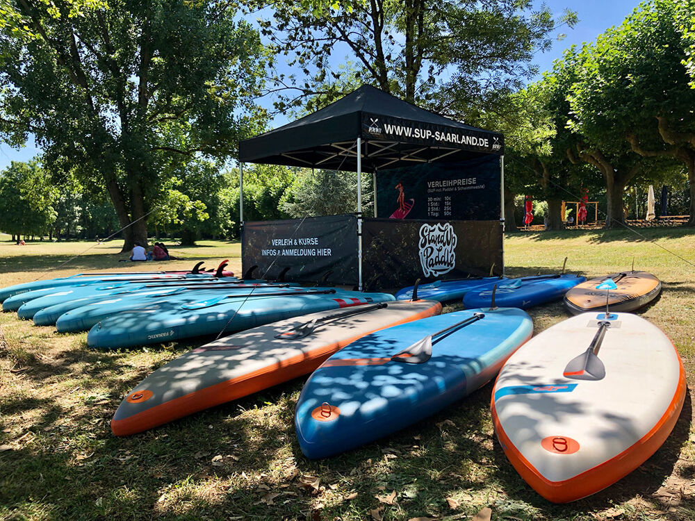 Since summer 2022 we also have a permanent Stand Up Paddleboard rental station in Saarbrücken on the banks of the river Saar, it is located directly on the Uferwiese next to the Kulturbiergarten (Navi/ Google Maps: SUP Station Saarbrücken, Koßmannstr., 66119 Saarbrücken). Access to the Saar is possible via a stone staircase directly at the station, we open mid-April - end of September depending on the weather. We also have different sizes of boards in stock in Saarbrücken, ranging from kids boards, beginner and touring boards to the 10.8" Fanatic Fly Air, which can easily carry 150Kg. We also have lockers where you can leave your valuables during the paddling time.