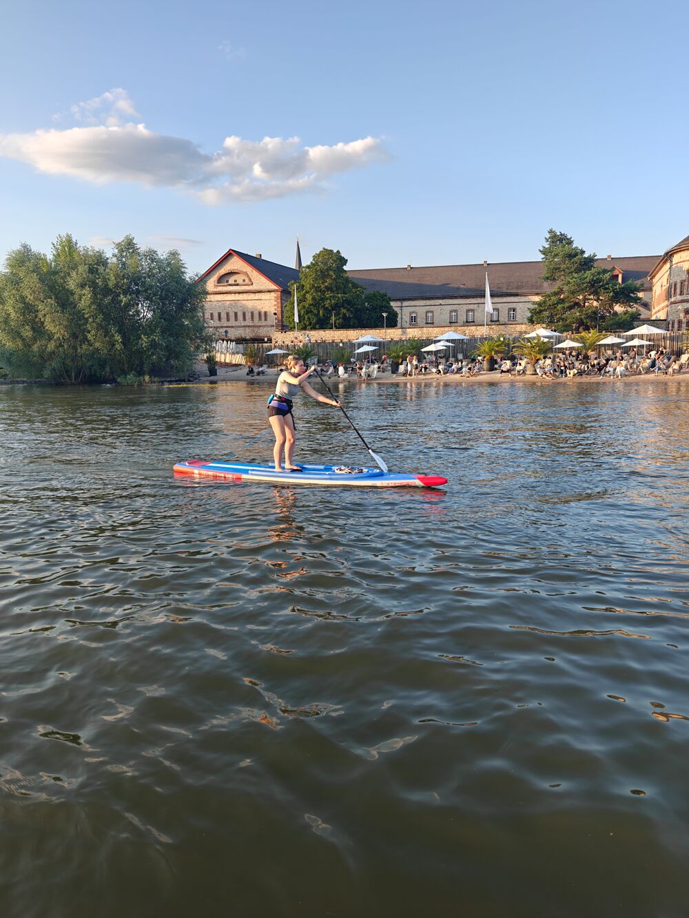 Stand-up paddling on the beach in Mainz-Kastel, just minutes from Mainz city center. Our station right on the shore offers you individual access, fun in nature and a cool community.